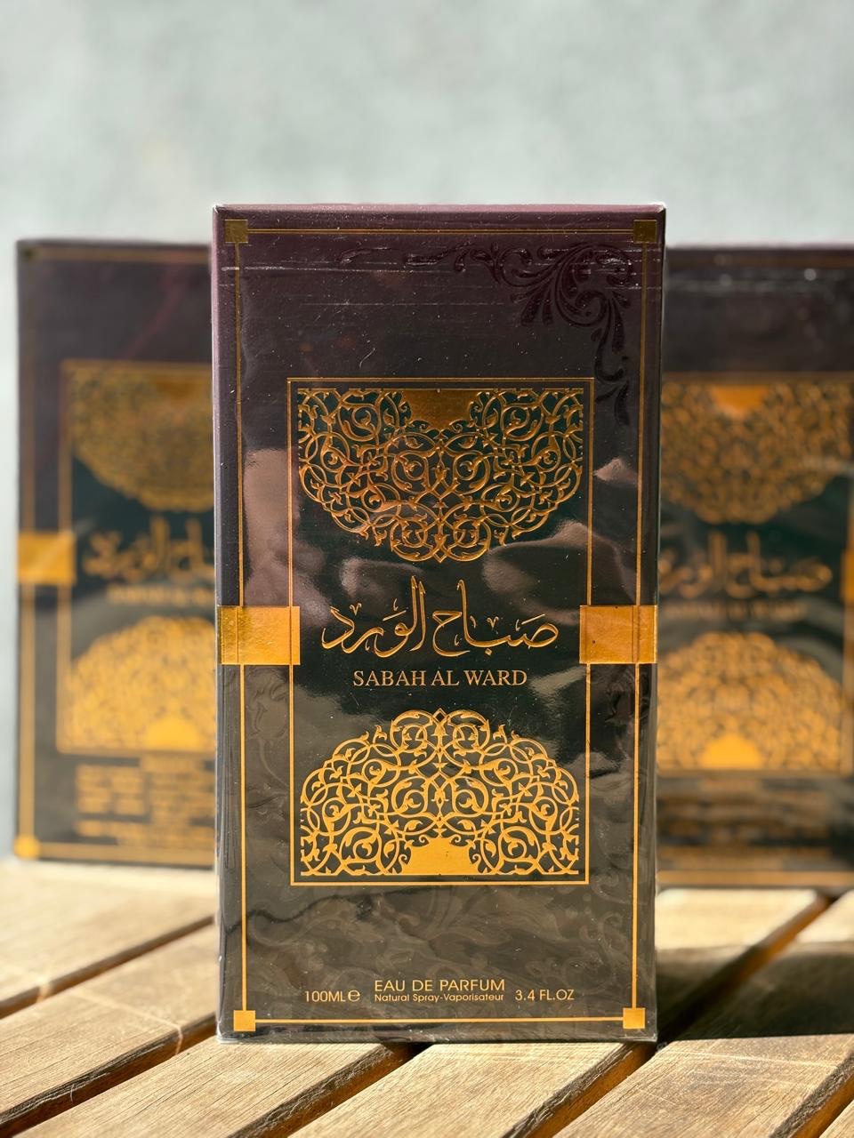 Perfume Sabah Al Ward de Al Wataniah (EDP 100 ml). Un ámbar-floral envolvente: abre con mandarina y pimienta rosa, corazón de flor de azahar, cacao y jazmín, y base cálida de vainilla, tonka y patchouli. Elegante y de larga duración.